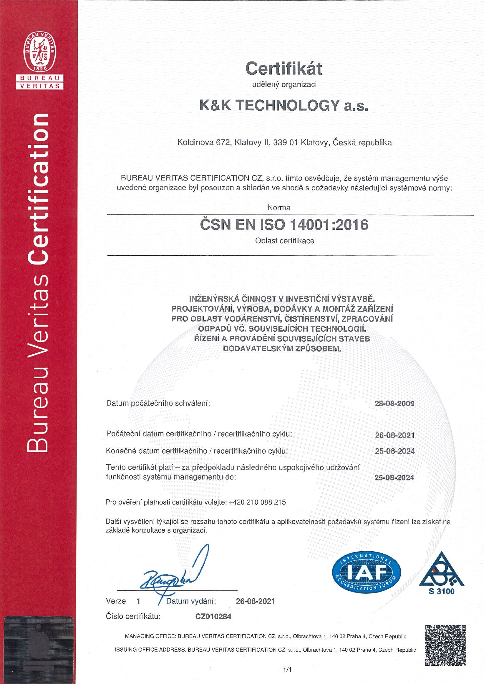 - certifikátu ČSN EN ISO 14001:2016, systém managementu environmentu společnosti,
