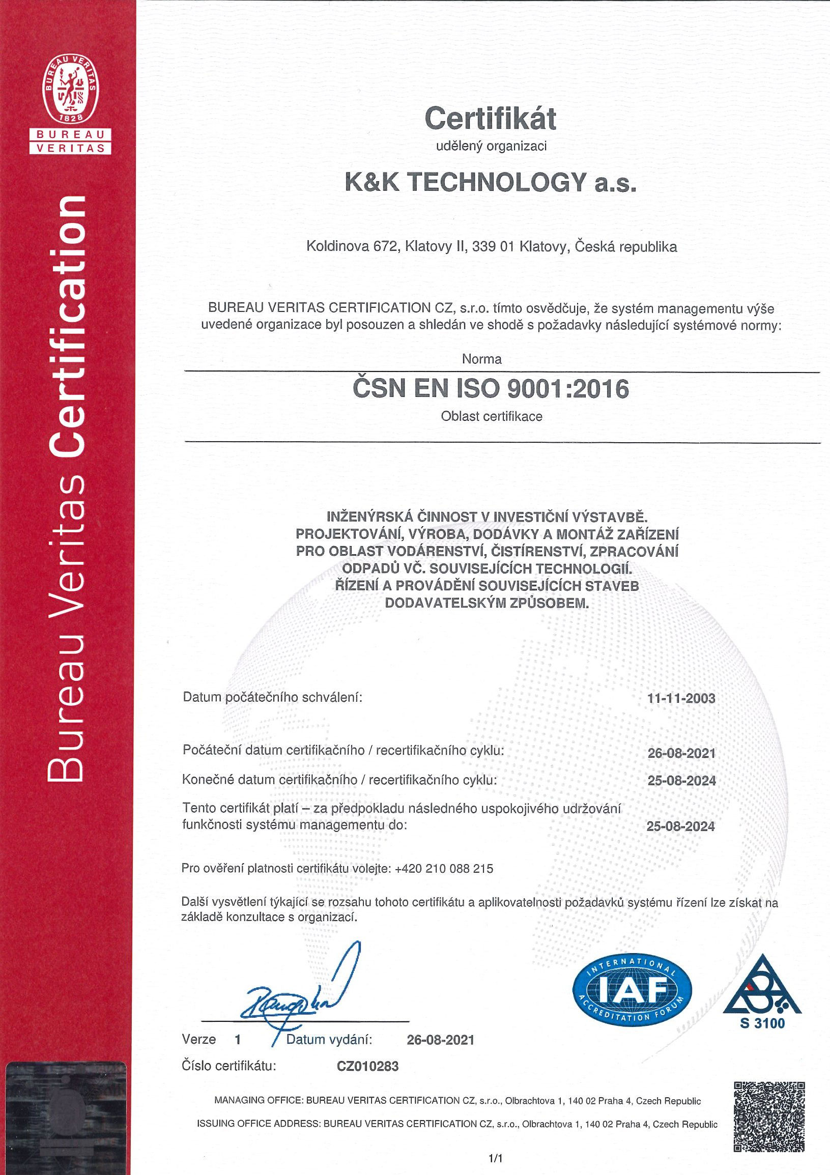 - certifikátu ČSN EN ISO 9001:2016, systém managementu kvality společnosti,