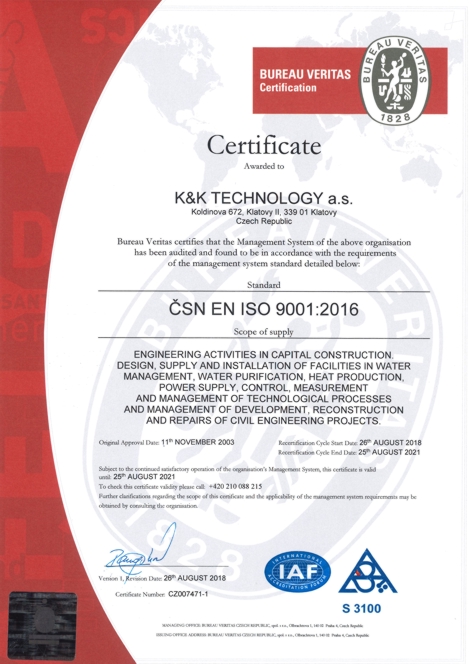 - сертификатов ČSN EN ISO 14001:2016, система для качества и окружающей среды,